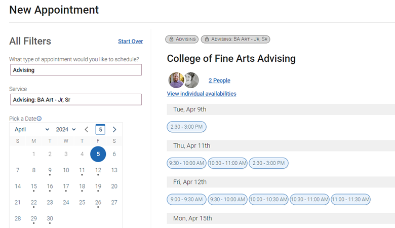 To make an appointment through Campus Connect, click on the CC icon on your myFSU portal. Once there, you can click on the blue “Get Advising or Tutoring” button on the right side of the screen. You can then follow the prompts to make an appointment. The College of Business does not have assigned advisors and you are free to meet with any advisor that is available.
