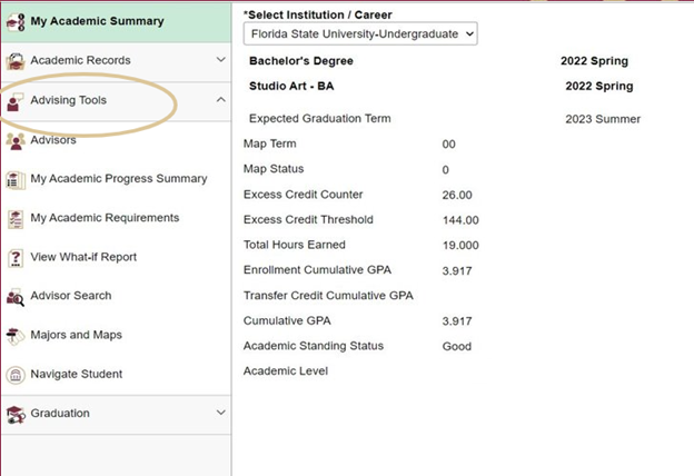To see remaining FSU Core requirements and major requirements, students can access their Academic Requirement Report through Student Central. In the Student Central portal, click “My Academics.”