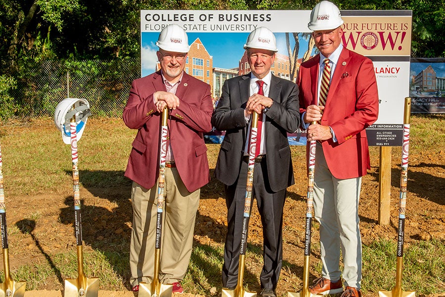 FSU President Richard McCullough, Board of Trustees Chairman Peter Collins and College of Business Dean Michael Hartline spoke before more than 400 guests at the Legacy Hall construction site just south of the Donald L. Tucker Civic Center.