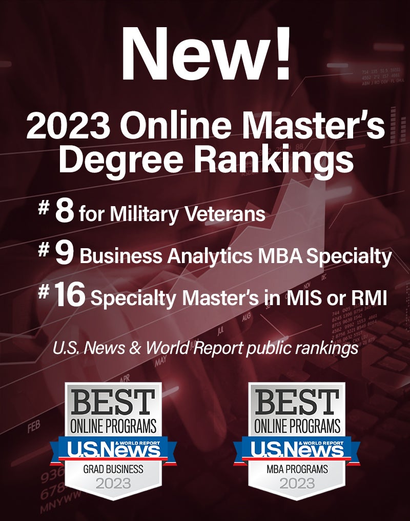 - No. 16 public ranking, No. 21 overall among best online graduate business degrees, specifically the online Management Information Systems (MS-MIS) and the online master's degree in the Dr. William T. Hold/The National Alliance Program in Risk Management and Insurance (MS-RMI).