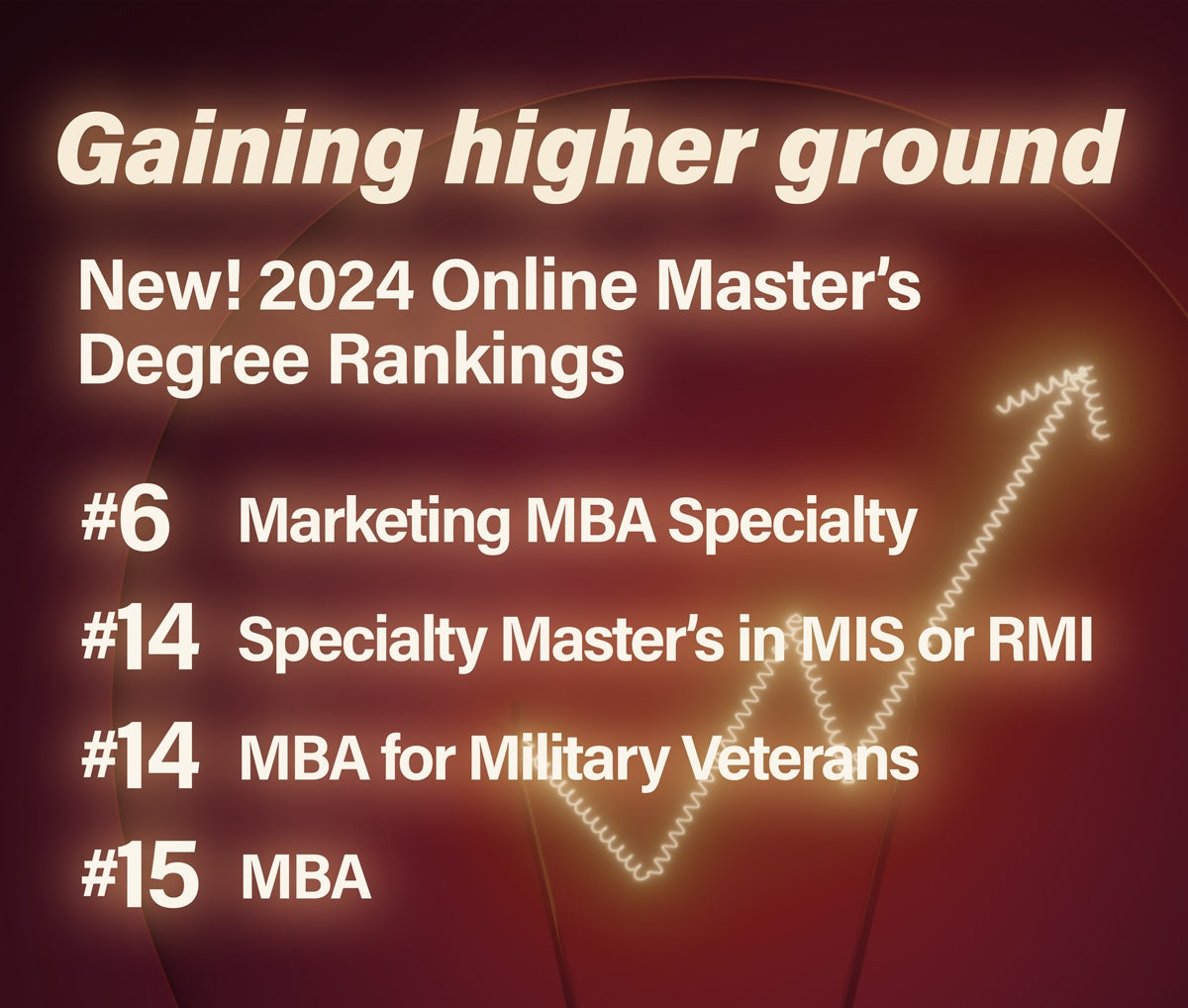 The college now ranks No. 18 overall for its two online specialty master’s degrees – specifically the online master’s degrees in management information systems (MS-MIS) and risk management and insurance (MS-RMI) – up from its No. 16 public ranking and No. 21 overall ranking last year. The MS-RMI is housed in the top-ranked Dr. William T. Hold/The National Alliance Program in Risk Management and Insurance.